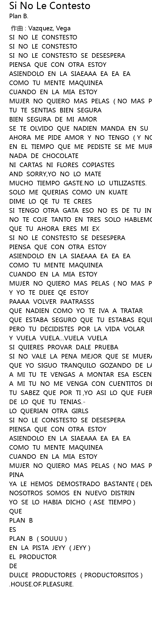 You got me confused. Como tu mente maquinea cuando en la mia yo estoy. Si No Le Contesto Lyrics by Plan B from the House of Pleasure album - including song video artist biography translations and more.