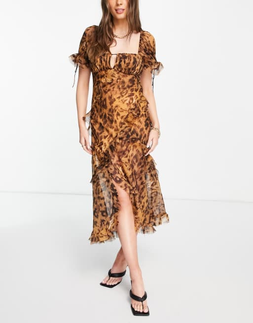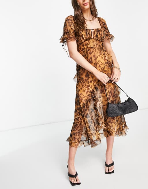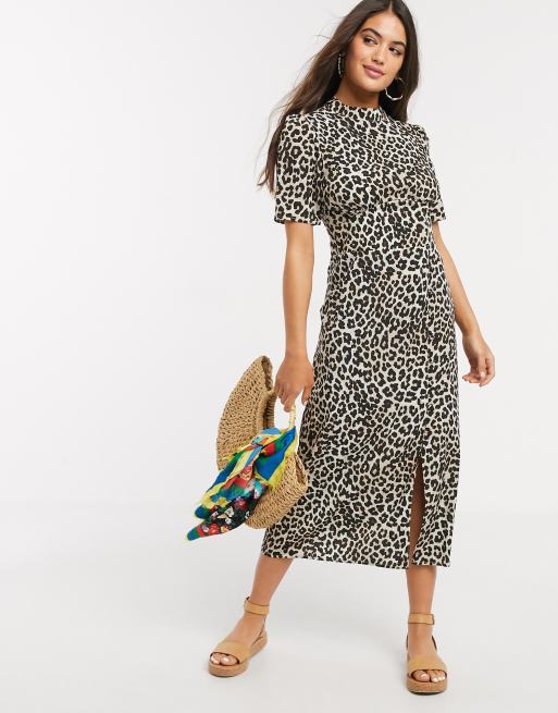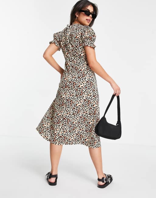 Leopard tea dress. Step into spring in a midi tea dress a dreamy floral print. Featuring a brown leopard print material with short sleeves and a floaty fit were obsessed. Notify me when in stock.