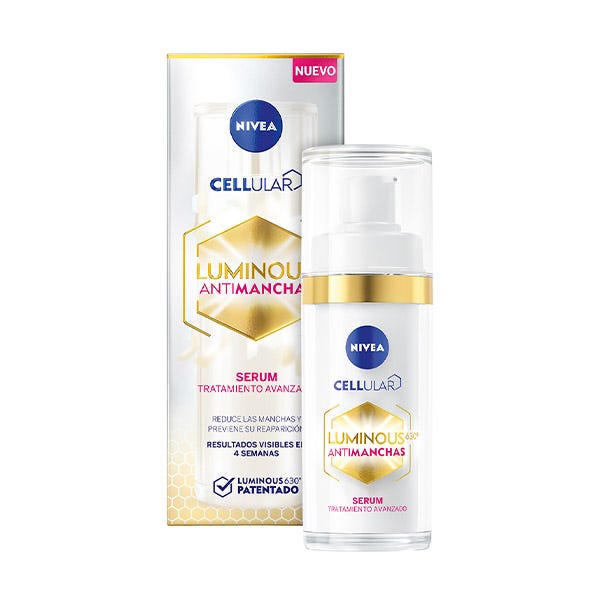 NIVEA Cellular LUMINOUS 630 Antimanchas Serum Tratamiento Avanzado es un eficaz sérum de textura ligera que reduce las manchas causadas por el sol por la edad y por factores hormonales y previene su reaparición para revelar la luminosidad natural del rostro. NIVEA Cellular LUMINOUS 630 Pack Antimanchas Tratamiento Avanzado set de regalo con sérum facial 1 x 30 ml y crema de día 1 x 40 ml para una.